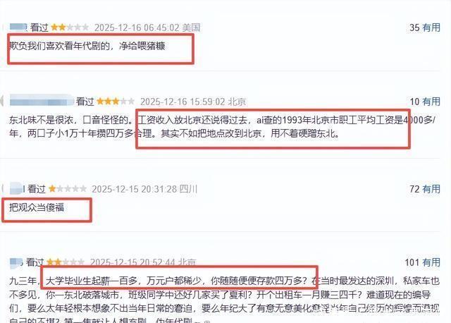 有不雅众截图对比:统一场戏里,王佳佳演的嫂子穿戴起球的毛衣,张可盈却像是刚从好意思容院出来,连头发丝都透着“细巧过度”。 更要命的是剧情硬伤。 90年代东北下岗工东说念主家里随粗率便拿出四万五入款,郭京飞唱两首歌就拿三万奖金,这些细节让经验过阿谁年代的不雅众直摇头。