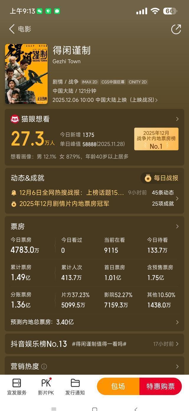得闲谨制上映2天,总票房1.5亿,首映1.01亿,第二日的票房,展望在6000多万,临了的总票房应该在3.4亿傍边