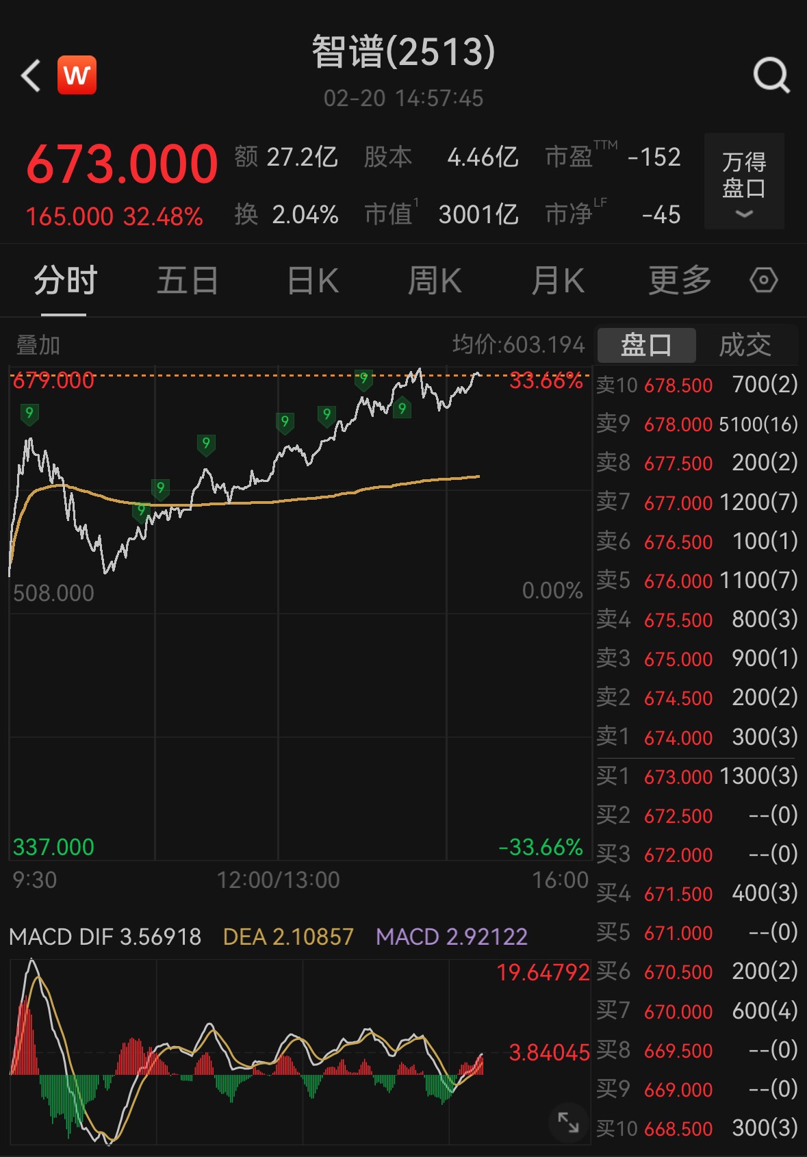 上证报中国证券网讯(记者何漪)2月20日,智谱午后抓续走强,股价冲高至679港元/股,创上市以来新高。限度14点57分,智谱涨32.48%,报673港元/股,成交额达到27.2亿港元,总市值达到3001亿港元。